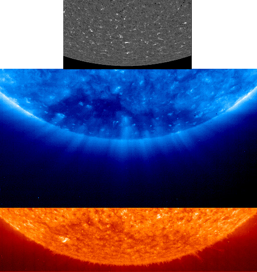 "Plumes" of outward flowing, hot gas in the Sun's atmosphere may be one source of the solar "wind" of charged particles. These images, taken March 7, 1996, by the Solar and Heliospheric Observatory (SOHO), show (top) magnetic fields on the sun's surface near the south solar pole; (middle) an ultraviolet image of the 1 million degree plumes from the same region; and (bottom) an ultraviolet image of the "quiet" solar atmosphere closer to the surface. The top image was taken by the Michelson-Doppler Imager/Solar Oscillations Investigation instrument. The center and bottom images were taken by the Extreme-ultraviolet Imaging Telescope (EIT). These images represent the first opportunity scientists have had to see the detailed development over time of the plume structures in which the solar wind is accelerated, at least at the solar poles. Because of SOHO's continuous view of the Sun, scientists have been able to make movies that allow us to understand the relationship between the magnetic field and the polar plumes. SOHO is a project of international cooperation between NASA and the European Space Agency. The spacecraft was launched by NASA Dec. 2, 1996 from Cape Canaveral Air Station in Florida. Science operations for the SOHO spacecraft are being conducted by a NASA-ESA team from the Experiment Operations Facility at the Goddard Space Flight Center in Greenbelt. Md. The spacecraft is presently in a halo orbit around a point known as the "L1 Lagrangian point" approximately 930,000 miles (1.5 million kilometers) from Earth, where gravitational forces of the Earth and Sun balance one another. |