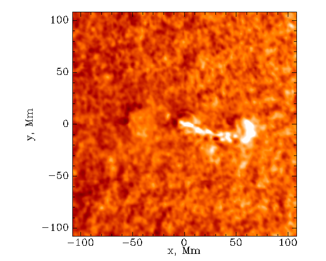 This is an image taken from a movie of the July 9, 1996 solar quake The images were made using the Michelson Doppler Imager onboard the Solar and Heliospheric Observatory (SOHO) spacecraft, a joint European Space Agency/NASA project. The white, feathery object in the center is the solar flare that caused the quake. A solar flare is an explosion in the atmosphere of the Sun, caused by the tearing and reconnection of strong magnetic fields. Although moderate in size, this flare released an enormous amount of energy. The energy released is equal to completely covering the Earth's continents with a yard of dynamite and detonating it all at once. Some of this energy was transferred to the solar surface by high speed electrons traveling within magnetic flux tubes, invisible tubes of magnetic energy. They produced X-rays, microwaves and shock waves that heated the solar surface. These shock waves are the solar quake, and can be seen as concentric rings spreading outward from beneath the flare, much like ripples spreading from a rock dropped into a pool of water. The flare-generated solar quake contained about 40,000 times the energy released in the great earthquake that devastated San Francisco in 1906. The amount of energy released was enough to power the United States for 20 years at its current level of consumption. This image shows the flare before the concentric ring forms. (Courtesy Dr. Alexander Kosovichev/Stanford University, the European Space Agency, and NASA) |