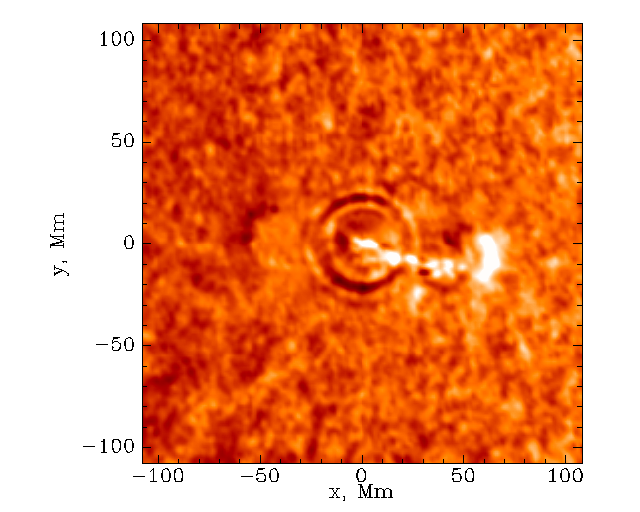 This is an image taken from a movie of the July 9, 1996 solar quake The images were made using the Michelson Doppler Imager onboard the Solar and Heliospheric Observatory (SOHO) spacecraft, a joint European Space Agency/NASA project. The white, feathery object in the center is the solar flare that caused the quake. A solar flare is an explosion in the atmosphere of the Sun, caused by the tearing and reconnection of strong magnetic fields. Although moderate in size, this flare released an enormous amount of energy. The energy released is equal to completely covering the Earth's continents with a yard of dynamite and detonating it all at once. Some of this energy was transferred to the solar surface by high speed electrons traveling within magnetic flux tubes, invisible tubes of magnetic energy. They produced X-rays, microwaves and shock waves that heated the solar surface. These shock waves are the solar quake, and can be seen as concentric rings spreading outward from beneath the flare, much like ripples spreading from a rock dropped into a pool of water. The flare-generated solar quake contained about 40,000 times the energy released in the great earthquake that devastated San Francisco in 1906. The amount of energy released was enough to power the United States for 20 years at its current level of consumption. (Courtesy Dr. Alexander Kosovichev/Stanford University, the European Space Agency, and NASA) |