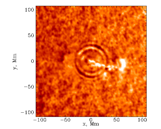 This is an image taken from a movie of the July 9, 1996 solar quake The images were made using the Michelson Doppler Imager onboard the Solar and Heliospheric Observatory (SOHO) spacecraft, a joint European Space Agency/NASA project. The white, feathery object in the center is the solar flare that caused the quake. A solar flare is an explosion in the atmosphere of the Sun, caused by the tearing and reconnection of strong magnetic fields. Although moderate in size, this flare released an enormous amount of energy. The energy released is equal to completely covering the Earth's continents with a yard of dynamite and detonating it all at once. Some of this energy was transferred to the solar surface by high speed electrons traveling within magnetic flux tubes, invisible tubes of magnetic energy. They produced X-rays, microwaves and shock waves that heated the solar surface. These shock waves are the solar quake, and can be seen as concentric rings spreading outward from beneath the flare, much like ripples spreading from a rock dropped into a pool of water. The flare-generated solar quake contained about 40,000 times the energy released in the great earthquake that devastated San Francisco in 1906. The amount of energy released was enough to power the United States for 20 years at its current level of consumption. (Courtesy Dr. Alexander Kosovichev/Stanford University, the European Space Agency, and NASA) |