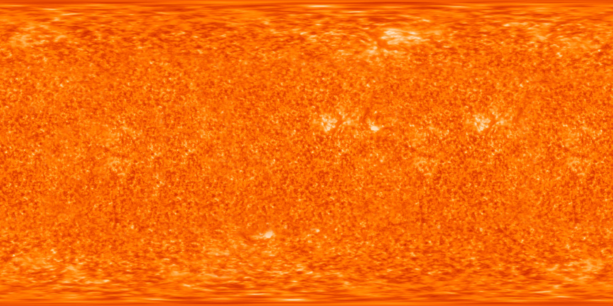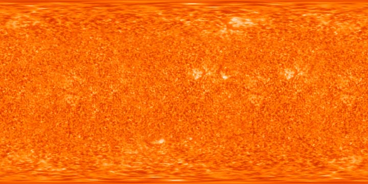 This simple cylindrical map of the Sun was created from a single image taken by the SOHO spacecraft. Permission is granted to use this map for personal or school related projects. For commercial applications, permission must be obtained from the author. You are welcome to link to this page, but please do not make copies of this map and place it on your web site. |