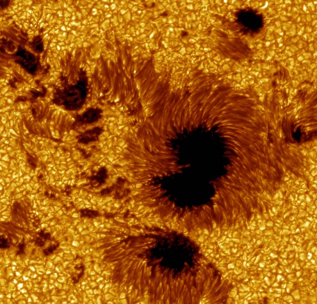 Large field-of-view image of sunspots in Active Region 10030 observed on 15 July 2002. The image has been colored yellow for aesthetic reasons: