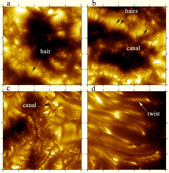 Examples of new kinds of solar structures found in or near sunspots with the Swedish 1-m Solar Telescope on La Palma. Panels a, b, and c show small sunspots ("pores") that have thin dark lines around their edges - dubbed "hairs". The surrounding solar surface show dark lines we call "canals". Panel d shows penumbral filaments with dark cores and one of the filaments seems to be twisted. The tickmarks around the edge of the images show the scale. The distance between two ticks is 1000 km.