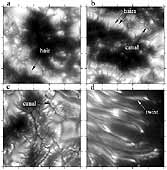 Examples of new kinds of solar structures found in or near sunspots with the Swedish 1-m Solar Telescope on La Palma. Panels a, b, and c show small sunspots ("pores") that have thin dark lines around their edges - dubbed "hairs". The surrounding solar surface show dark lines we call "canals". Panel d shows penumbral filaments with dark cores and one of the filaments seems to be twisted. The tickmarks around the edge of the images show the scale. The distance between two ticks is 1000 km.