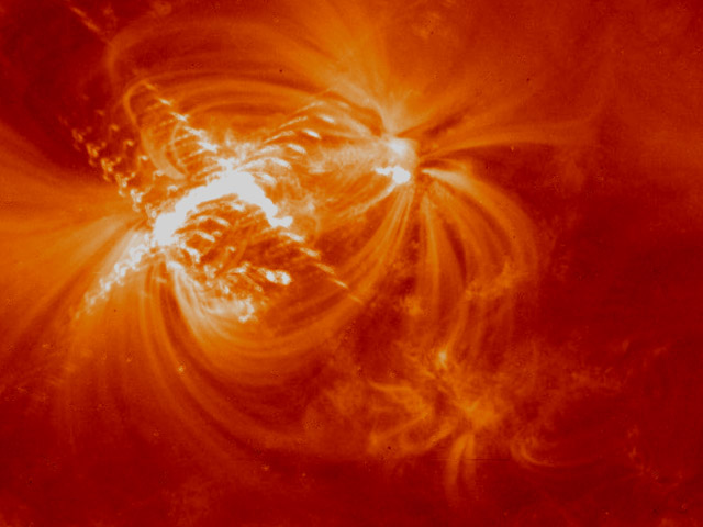 This sequence of solar images was taken using NASA's Transition Region and Coronal Explorer (TRACE) spacecraft on July 14, 1998. Coronal loops, immense coils of hot gas on the surface of the Sun, vibrate wildly after the blast wave from a solar flare hits them. The flare is the bright area in the top left of each image, with surrounding coronal loops below and to the right. The X-shaped starburst pattern is just an instrument artifact. In the middle (trace02.htm) and bottom (trace03.htm) images, the displacement of the bottom loops is prominent as the flare blast wave hits them and they snap back to their original position. This causes them to vibrate back and forth for several minutes. However, their dance is quickly squelched by resistance from the Sun's outer atmosphere (corona). The corona restricts motion due to internal friction hundreds of millions of times greater than expected, according to recent observations from NASA's Transition Region and Coronal Explorer (TRACE) spacecraft. This friction, called viscosity, may help explain why the corona is more than 100 times hotter than the Sun's surface, a mystery that has occupied solar researchers for decades. Just as a guitar string vibrates when plucked, coronal loops move back and forth after being disturbed by a flare. The new TRACE observations show that, rather than vibrating like they are in thin air, the loops act as if they are trying to vibrate in something much thicker, like pudding. This rapidly halts their swaying motion -- it stops after twelve minutes or so. If the original theories on coronal viscosity were correct, the loops would continue vibrating for more than a week. Solar physicists suspect that magnetic energy produced by the roiling, electrically charged gases on the solar surface is somehow transferred to the corona, heating it. However, the old theory of a low viscosity corona made the process so inefficient that scientists could not see how it was done. This new discovery reveals a high viscosity corona with a lot of friction that can be used to transfer energy and generate heat much more efficiently. |
