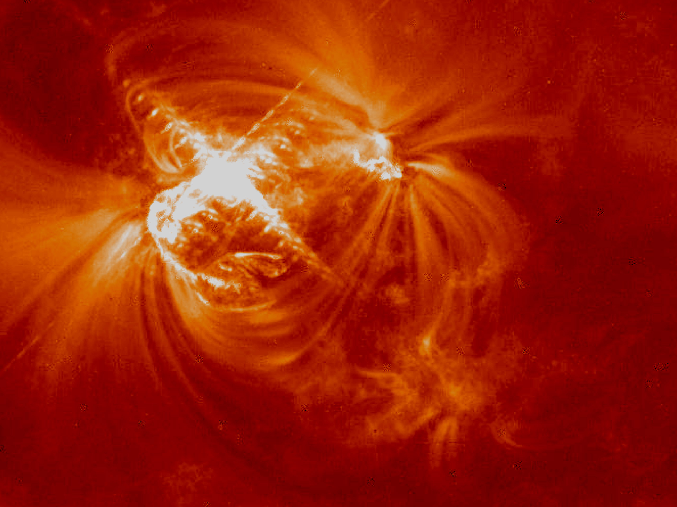 In the middle (trace02.htm) and bottom (trace03.htm) images, the displacement of the bottom loops is prominent as the flare blast wave hits them and they snap back to their original position. This causes them to vibrate back and forth for several minutes.