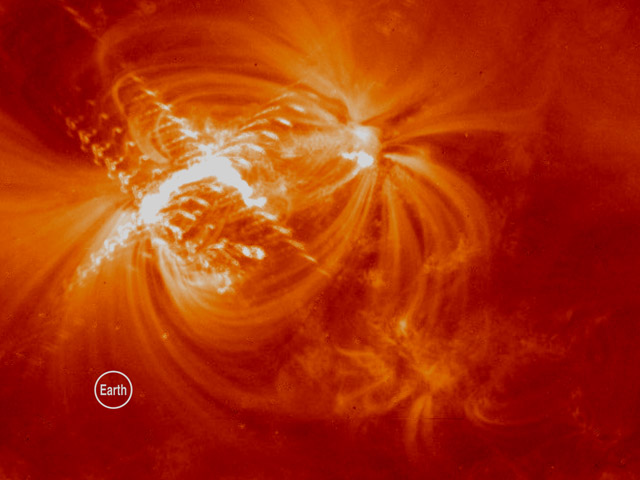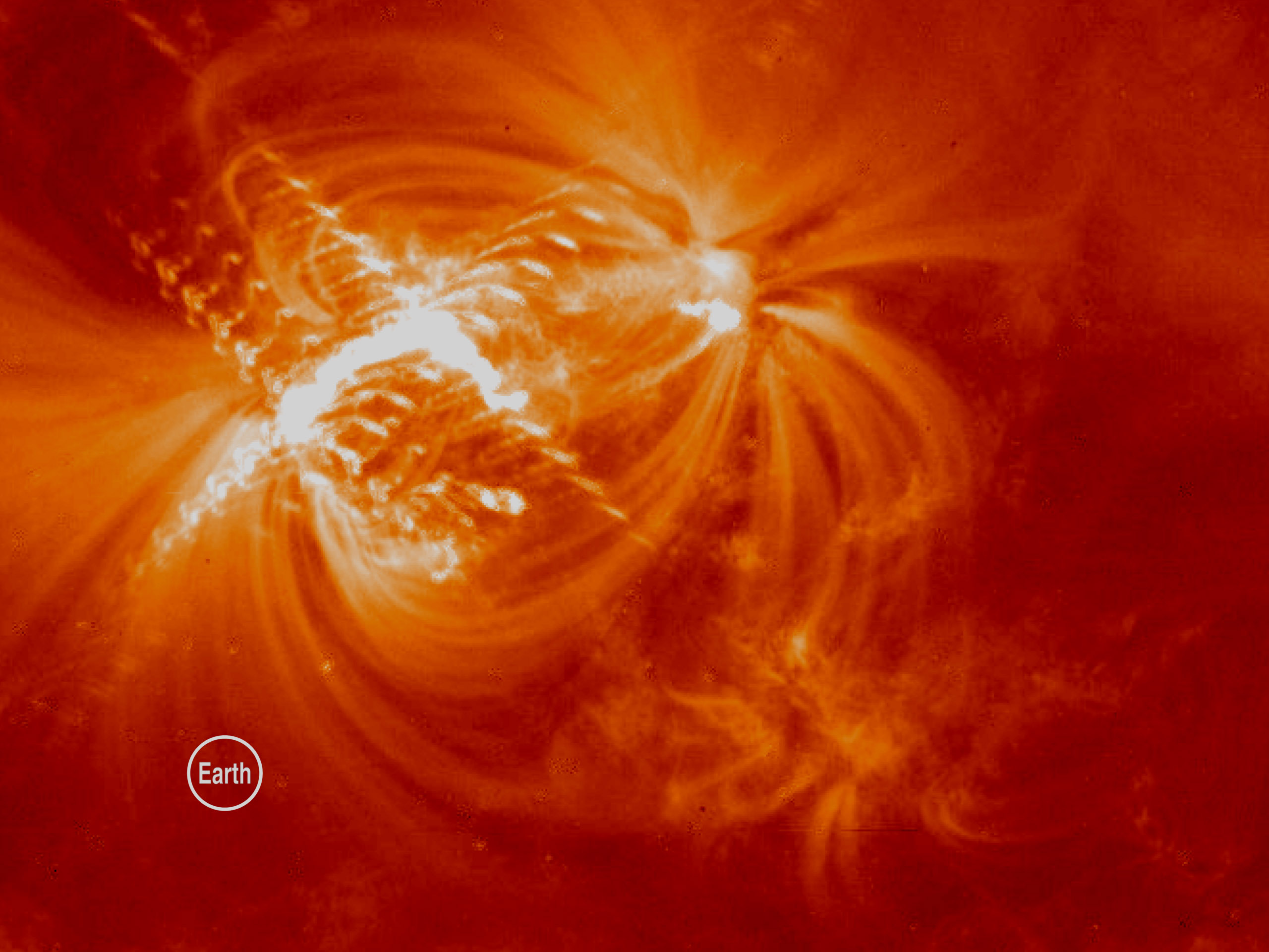 In the middle (trace02.htm) and bottom (trace03.htm) images, the displacement of the bottom loops is prominent as the flare blast wave hits them and they snap back to their original position. This causes them to vibrate back and forth for several minutes.