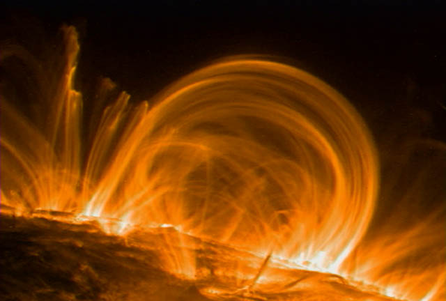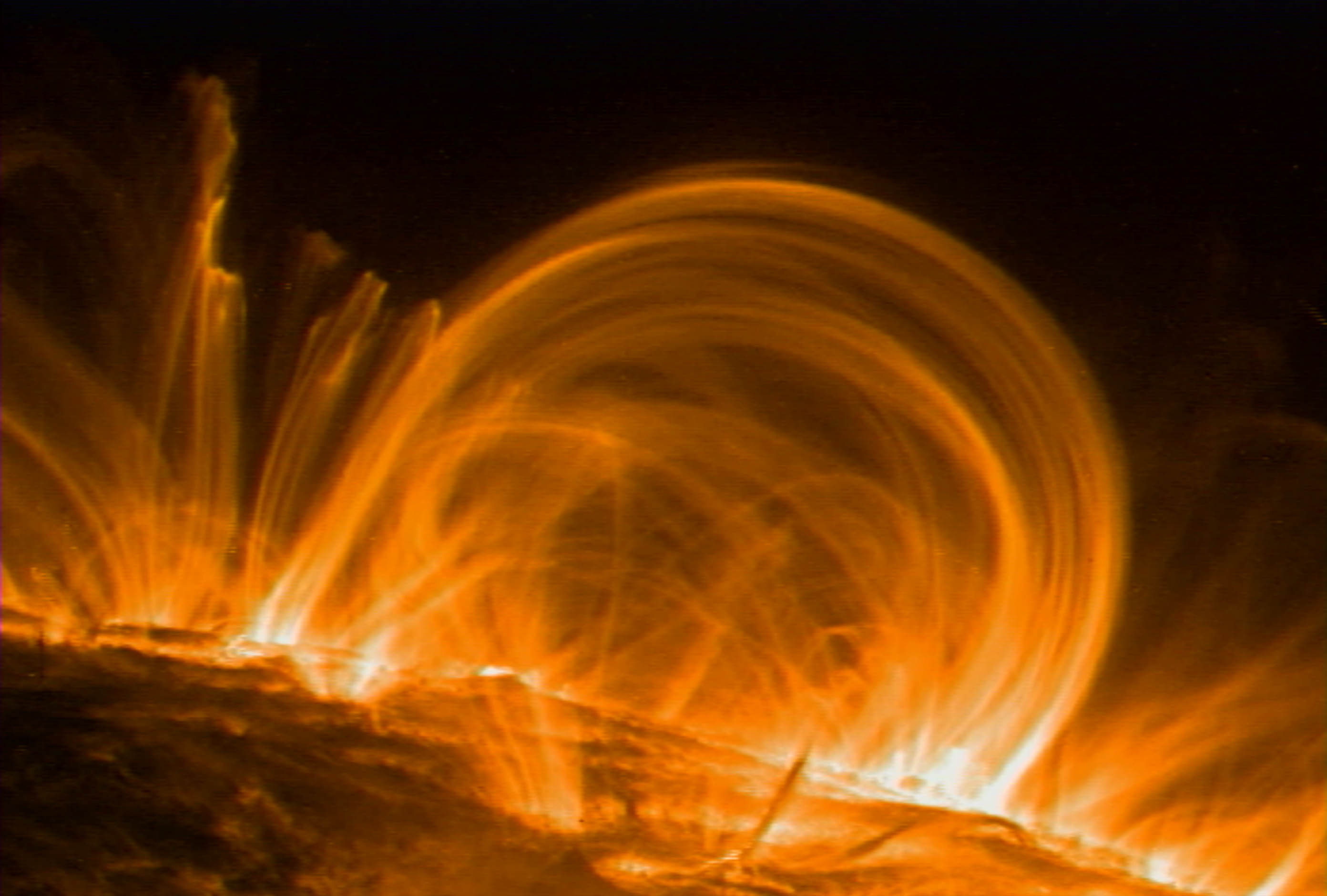Fountains of multimillion-degree, electrified gas in the atmosphere of the Sun have revealed the location where the solar atmosphere is heated to temperatures 300 times greater than the Sun's visible surface. Scientists discovered this important clue for solving the long-standing mystery of the hot solar atmosphere while observing the gas fountains (known as coronal loops) in unprecedented detail with NASA's Transition Region and Coronal Explorer (TRACE) spacecraft. Scientists are interested in the Sun's outer atmosphere, called the corona, because eruptive events occurring in this region can disrupt high-technology systems on Earth. Moreover, studies of the solar corona will help astronomers better understand other stars, which cannot be observed in as fine detail as the Sun. The new observations reveal the location of the unidentified energy source, showing that most of the heating occurs low in the corona, within about 10,000 miles (16,000 kilometers) from the Sun's visible surface. The gas fountains form arches (some more than 300,000 miles high and capable of spanning 30 Earths) as gas emerges from the solar surface, is heated and rises while flowing along the solar magnetic field, then cools and crashes back to the surface at more than 60 miles per second (100 kilometers per second). Millions of different-sized arches, called coronal loops, comprise the corona, and a 30-year old theory assumes that the loops are heated evenly throughout their height. The TRACE observations show that instead, most of the heating must occur at the bases of the coronal loops, near where they emerge from and return to the solar surface. This image is a false color picture of ultraviolet light emitted by the hot gas that comprises the coronal loops. Ultraviolet light is invisible to the human eye, but detectable by the special instruments on board TRACE. White represents the brightest ultraviolet light. For images and more information on the Internet, visit: Views of the Solar System's Sun Page. |
