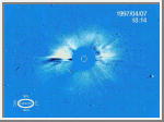 This movie shows the April 7, 1997 solar eruption occurring, as observed by the LASCO coronagraph. The circle shown in the center of the image outlines the sun, where it has been shielded. By blocking out the sun in this manner, we are more able to observe activity which is less bright in the solar atmosphere. In this case, we see a large eruption of material, first coming from the lower left corner, and then finally emerging in all directions.