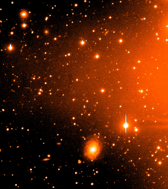 This shows the discovery image of Caliban a faint moon of Uranus. It is designated as S/1997 U 1 and was later named Caliban. The glare from Uranus, which was placed intentionally off the frame to avoid saturating the detector, is visible at the right. The moon must be located by looking at the image 1997u1. |