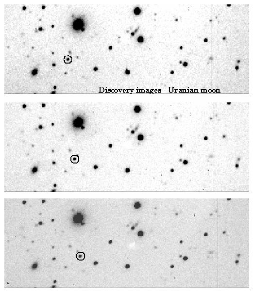 This shows the discovery image of brighter of the two new moons of Uranus. It is designated as Sycorax (S/1997 U 2) and later names Sycorax. Notice the motion of the moon (circled) with respect to the background stars. The images were taken roughly one hour apart on September 7, 1997. A faint asteroid in the main belt (not circled) may also be observed and identified by its much faster rate of motion. |