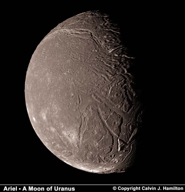 This image of Ariel is a a composite of four clear filter images taken by the Voyager 2 spacecraft on January 24, 1986, from a distance of 130,000 kilometers (80,000 miles). Two of these images that covered the terminator on the right were smeared because of the longer exposure times. The color is based upon lower resolution color images. Much of Ariel's surface is densely pitted with craters 5 to 1O kilometers (3 to 6 mi) across. These craters are close to the threshold of detection in this picture. Numerous valleys and fault scarps crisscross the highly pitted terrain. Voyager scientists believe the valleys have formed over down-dropped fault blocks (graben); apparently, extensive faulting has occurred as a result of expansion and stretching of Ariel's crust. The largest fault valleys, near the terminator at right, as well as a smooth region near the center of this image, have been partly filled with deposits that are younger and less heavily cratered than the pitted terrain. Narrow, somewhat sinuous scarps and valleys have been formed, in turn, in these young deposits. It is not clear whether these sinuous features have been formed by faulting or by the flow of fluids. This image is Copyright © by Calvin J. Hamilton. Any commercial/for-profit use of this image needs to be addressed to Calvin J. Hamilton. |