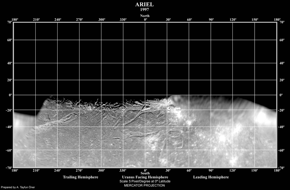 This image is a mercator map of Ariel. The map covers from 70 to -70 degrees latitude with 0 degree longitude located at the center. The scale is 5 km/pixel at the equator. (Courtesy A.Tayfun Oner) This image is Copyright © 1997 by A. Tayfun Oner. Any commercial/for-profit use of this image needs to be addressed to Calvin J. Hamilton. |