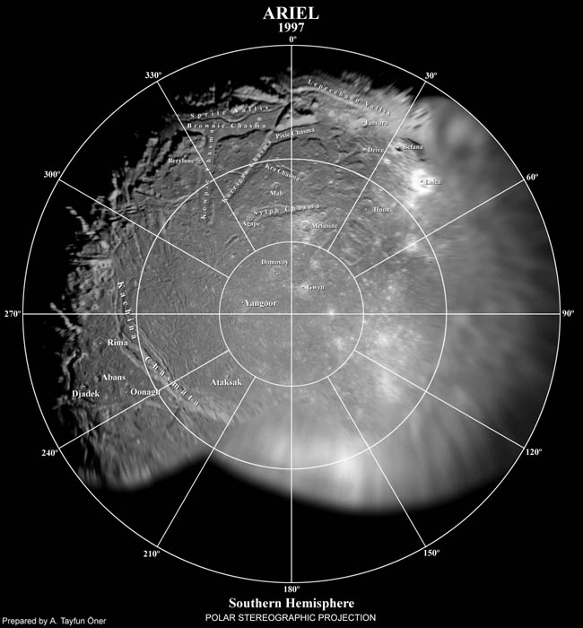 This image is a polar stereographic map of the southern hemisphere of Ariel. Zero degrees longitude is at the top. The best unsmeared Voyager 2 images of Ariel were used in making this map. (Courtesy A.Tayfun Oner) This image is Copyright © 1997 by A. Tayfun Oner. Any commercial/for-profit use of this image needs to be addressed to Calvin J. Hamilton. |