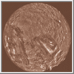 Uranus' moon Miranda is shown in a computer-assembled mosaic of images obtained January 24, 1986, by the Voyager 2 spacecraft. Miranda is the innermost and smallest of the five major Uranian satellites, just 480 kilometers (about 300 miles) in diameter. This image is a full-disc, south-polar view of the moon showing the varying geologic provinces of Miranda. The moon's surface consists of two major strikingly different types of terrain. One is an old, heavily cratered, rolling terrain with relatively uniform albedo, or reflectivity. The other is a young, complex terrain characterized by sets of bright and dark bands, scarps and ridges. These are features found in the ovoid regions at right and left and in the distinctive chevron feature below and right of center. |