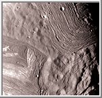 This view of Miranda shows details as small as 600 meters across. It was acquired by Voyager 2 on January 24, 1986. This is a close-up view of the chevron which shows the light and dark grooves with its sharp boundaries. The upper right shows a region of uniformly dark grooved terrain. The area shown is about 150 kilometers (93 miles) on a side. This image is Copyright © 2001 by Calvin J. Hamilton. Any commercial/for-profit use of this image needs to be addressed to Calvin J. Hamilton. |