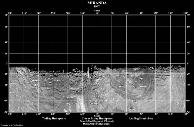 This image is a mercator map of Miranda. The map covers from 70 to -70 degrees latitude with 0 degree longitude located at the center. The scale is 5pixels/degree at the equator. |