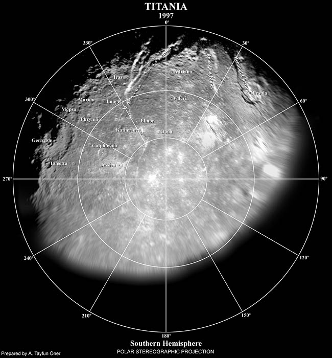 This image is a polar stereographic map of the southern hemisphere of Titania. The map was made from the three highest resolution clear filter images taken by Voyager 2. The two best images were averaged in order to decrease the noise. The resulting image and the third highest resolution clear image were then projected into a polar stereographic projection and mosaicked together. Zero degrees longitude (the central longitude of the side that is facing Uranus) is at the top. (Courtesy A.Tayfun Oner) This image is Copyright © 1997 by A. Tayfun Oner. Any commercial/for-profit use of this image needs to be addressed to Calvin J. Hamilton. |