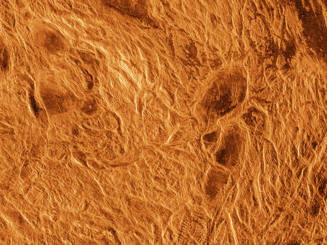 This image shows a closeup Alpha Regio. The bright lineated terrain is a series of troughs, ridges, and faults that are oriented in many directions. The lengths of these features generally range from 10 kilometers (6.3 miles) to 50 kilometers (31.3 miles). The topographic elevation within Alpha Regio varies over a range of 4 kilometers (2.5 miles). Local topographic lows, whose outlines are generally controlled by structures within the central region, are relatively radar-dark and filled with volcanic lavas. Source vents for this volcanism appear as bright spots within the smooth plains units. This image is in the public domain and is copyright free. |