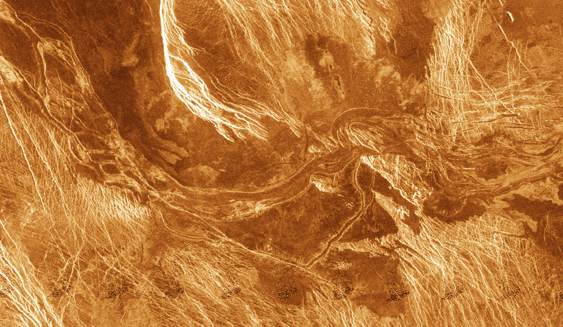 Anastomosing reach of outflow channel shows streamlined islands that point eastward in the flow direction of the lava deposits. Radar-dark embayments in highland areas denote lava ponding and flooding that occurred prior to eastward channel cutting and the formation of the distributary reach east of the highlands (right center). This image is Copyright © by Calvin J. Hamilton. Any commercial/for-profit use of this image needs to be addressed to Calvin J. Hamilton. |
