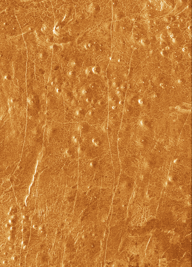 The cone volcanoes in this cluster are about 2 kilometers (1.2 miles) in diameter, 200 meters (660 feet) high, with 12° steep slopes overlying a fracture network in Niobe Planitia. Some cones are cut by younger, more widely spaced, north-striking fractures with curvilinear outlines. This image is Copyright © by Calvin J. Hamilton. Any commercial/for-profit use of this image needs to be addressed to Calvin J. Hamilton. |