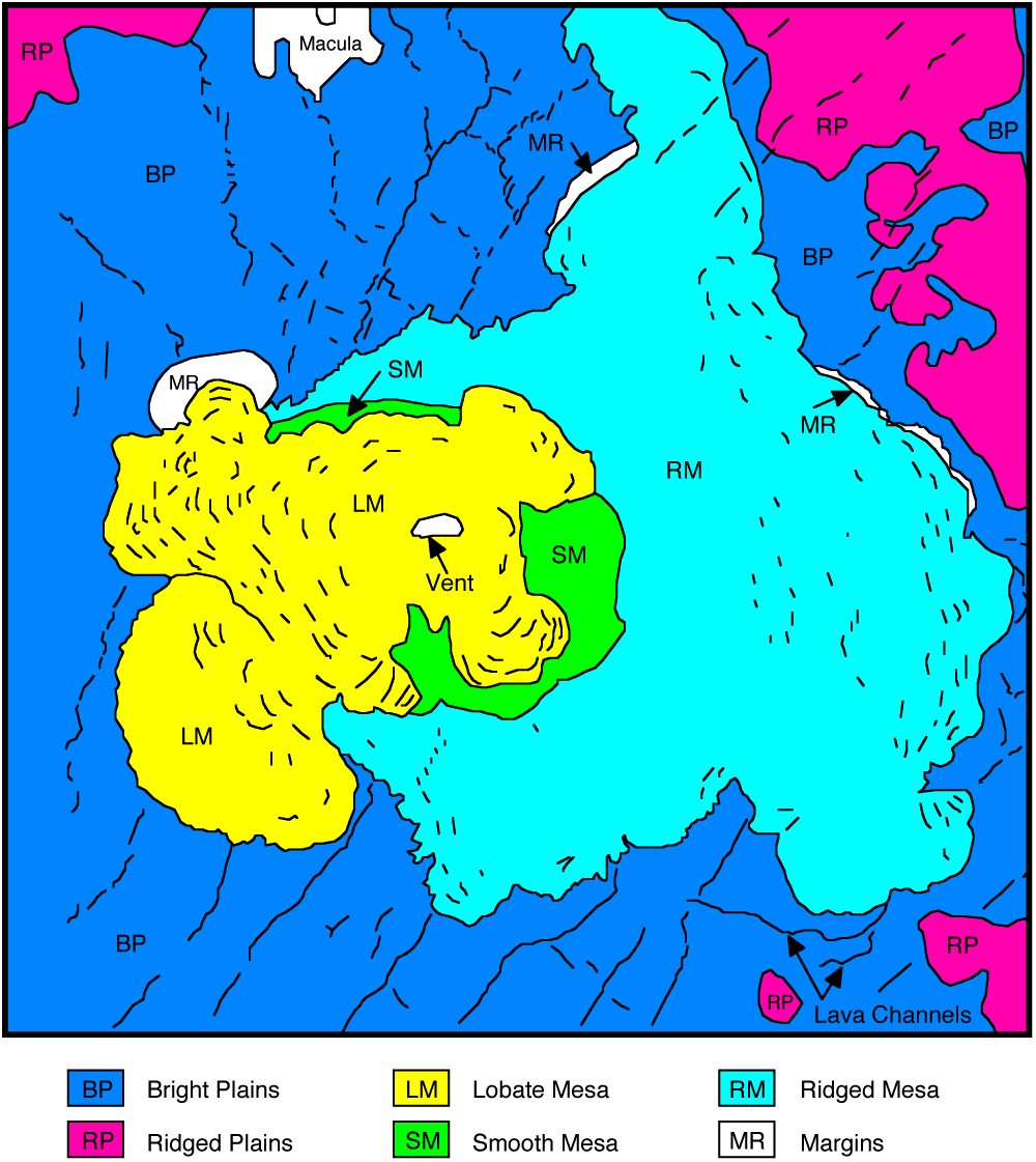 This diagram shows the volcano broken down into six types of regions. Measurements indicate that in the ridged mesas the scarps have relief up to 205 meters (673 feet); in the lobate mesas, the relief is from 133 to 723 meters (436 to 2,372 feet). See also the Magellan image of the Festoon Flows. This image is Copyright © by Calvin J. Hamilton. Any commercial/for-profit use of this image needs to be addressed to Calvin J. Hamilton. |
