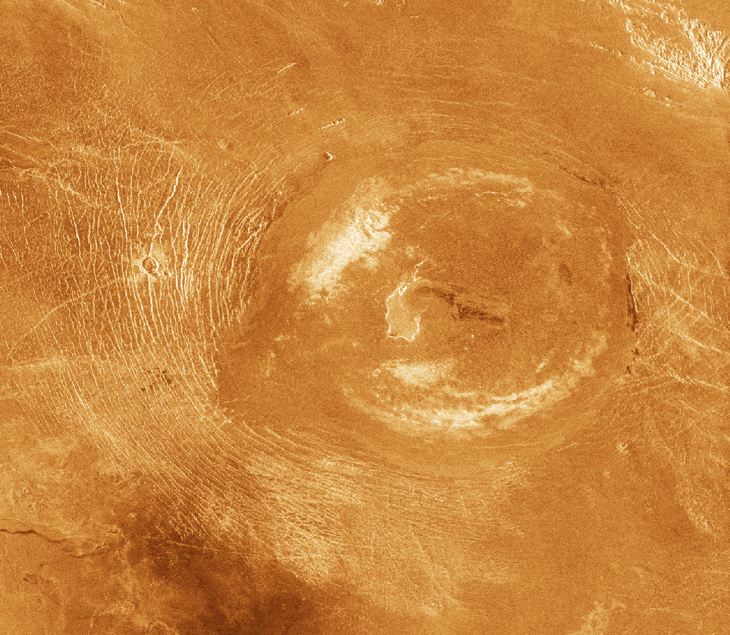 Sacajawea Patera is an elliptical caldera measuring 260 by 175 kilometers (160 to 109 miles) that forms a depression about 2 kilometers (1.2 miles) deep. The depression is enclosed by a zone of concentric troughs that show radar-bright outlines extending from 60 to 130 kilometers (37 to 80 miles) outward from the caldera floor. The floor is covered with smooth mottled plains. The brightest deposits occur around the periphery and near the center of the caldera floor where there is a ponded leveed flow. Linear to sinuous scarps show bright outlines that extend southeast from the eastern margin of the caldera. A small shield measuring 12 kilometers (7.4 miles) in diameter is transected by one of these features. This image is Copyright © by Calvin J. Hamilton. Any commercial/for-profit use of this image needs to be addressed to Calvin J. Hamilton. |