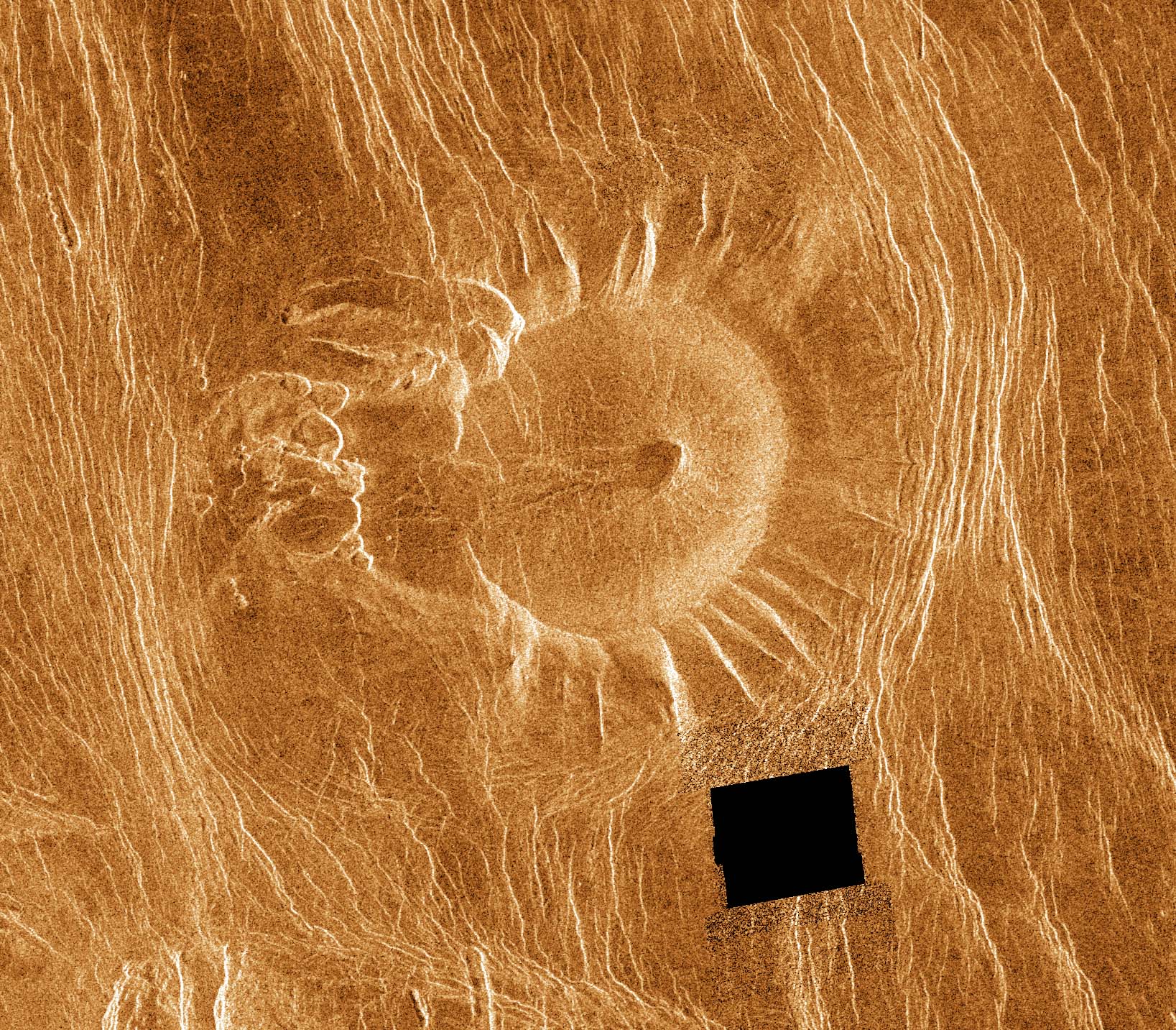 Scientists nicknamed this type of volcano a tick. About 65.6 kilometers (41 miles) across at the base, this volcano has a flat, concave summit 34.8 kilometers (22 miles) in diameter. The sides of the volcano are characterized by radiating ridges and valleys. The rim of the volcano to the west appears to have been breached by dark lava flows that emanated from a shallow summit pit 5.4 kilometers (3.4 miles) in diameter and traveled west along a channel. A series of coalescing, collapsed pits 2 to 10 kilometers (1.2 to 6.2 miles) in diameter is 10 kilometers (6.2 miles) west of the summit rim. The black square represents missing data. This image is Copyright © by Calvin J. Hamilton. Any commercial/for-profit use of this image needs to be addressed to Calvin J. Hamilton. |