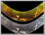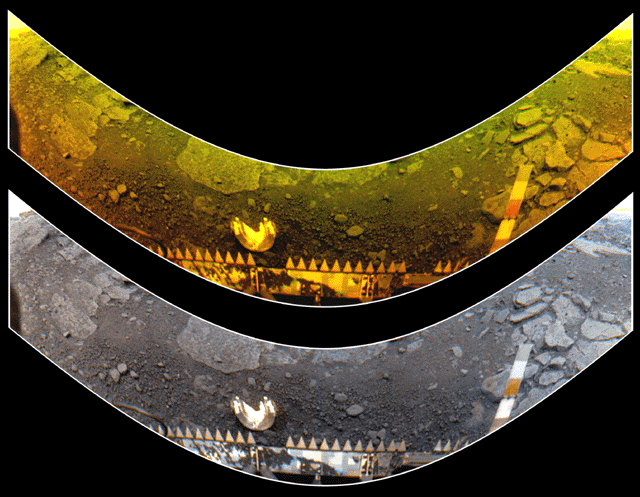 This is a geometrically corrected image of the Venera 13 color panorama of Venus. The Venera 13 lander touched down on the Venusian surface on March 1, 1982 at 7.5° S, 303° E, east of Phoebe Regio. Venera 13 was the first mission to include a color TV camera. The lander survived on the surface for 2 hours, 7 minutes, long enough to obtain 14 images. The color panorama was produced using dark blue, green and red filters. The top image is as it actually appeared, the bottom is color corrected for how it would look if not for Venus's atmosphere causing the yellowish orange coloring. |