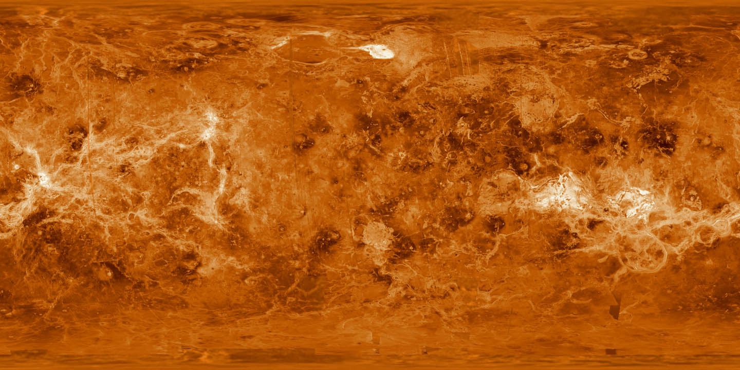 This simple cylindrical map of Venus was produced by the USGS from Magellan radar data with gaps filled in with USGS global texture. |