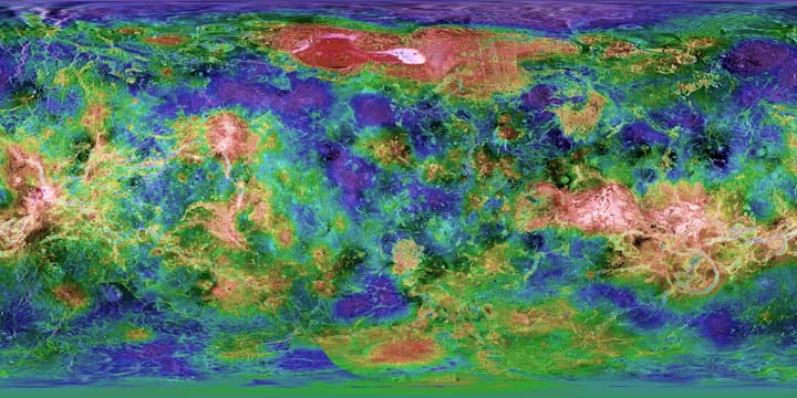 This simple cylindrical map of Venus was created from Magellan radar and topographical image data. Elevation is color coded such that purples and blues are the lowest elevation and reds and whites, the highest. Permission is granted to use this map for personal or school related projects. For commercial applications, permission must be obtained from the author. You are welcome to link to this page, but please do not make copies of this map and place it on your web site. |