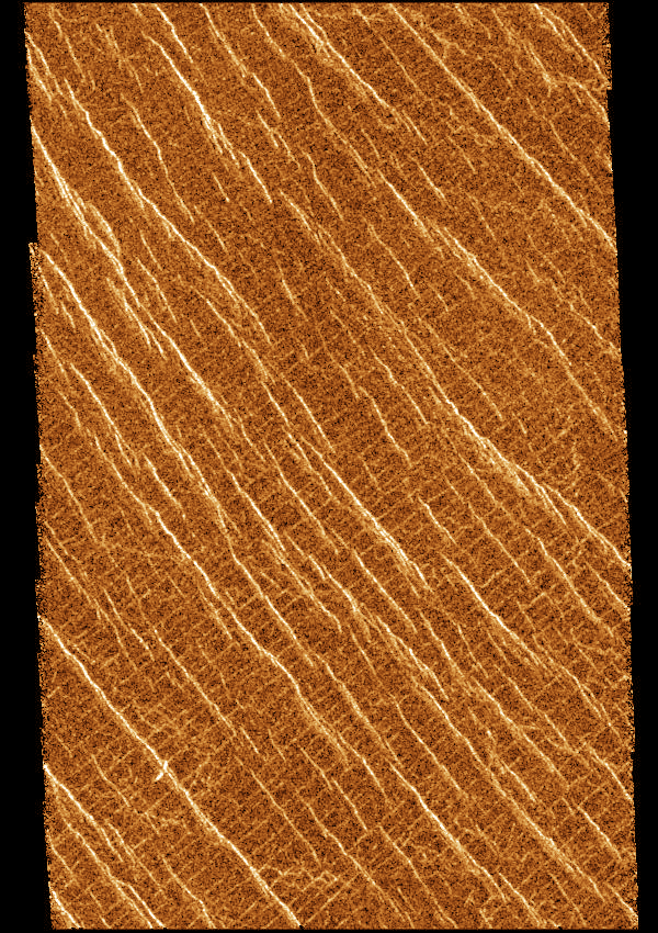 Two groups of parallel features that intersect almost at right angles are visible. The regularity of this terrain caused scientists to nickname it graph paper terrain. The fainter lineations are spaced at intervals of about 1 kilometer (.6 miles) and extend beyond the boundaries of the image. The brighter, more dominant lineations are less regular and often appear to begin and end where they intersect the fainter lineations. It is not yet clear whether the two sets of lineations represent faults or fractures, but in areas outside the image, the bright lineations are associated with pit craters and other volcanic features. This image is Copyright © by Calvin J. Hamilton. Any commercial/for-profit use of this image needs to be addressed to Calvin J. Hamilton. |