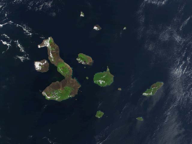 This true-color image of the Galapagos Islands was acquired on March 12, 2002, by the Moderate-resolution Imaging Spectroradiometer (MODIS), flying aboard NASA's Terra satellite. The Galapagos Islands, which are part of Ecuador, sit in the Pacific Ocean about 1000 km (620 miles) west of South America. The islands sit on the Galapagos rift, an offshoot of the East Pacific Rise. The islands were formed by volcanic eruptions, which took place millions of years ago. The islands straddle the equator in a chain of 13 large island and many smaller ones. They lie between 1° north and 1°3' south, and lies between 89 and 92° west longitude. With the exception Isabella, the islands have high volcanic craters at the island centers, that rise to 1,520 meters and are roughly circular in shape. Unlike most remote islands in the Pacific, the Galapagos have gone relatively untouched by humans over the past few millennia. As a result, many unique species have continued to thrive on the islands. Over 95 percent of the islands’ reptile species and nearly three quarters of its land bird species cannot be found anywhere else in the world. Two of the more well known are the Galapagos giant tortoise and marine iguanas. The unhindered evolutionary development of the islands’ species inspired Charles Darwin to begin The Origin of Species eight years after his visit there. To preserve the unique wildlife on the islands, the Ecuadorian government made the entire archipelago a national park in 1959. Each year roughly 60,000 tourists visit these islands to experience what Darwin did over a century and a half ago. |
