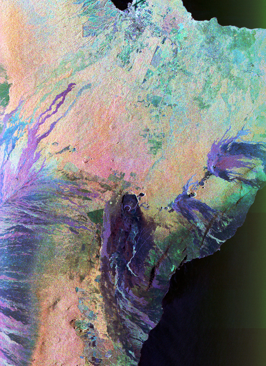 This color composite C-band and L-band image of the Kilauea volcano on the Big Island of Hawaii was acquired by the Spaceborne Imaging Radar-C/X-band Synthetic Aperature Radar (SIR- C/X-SAR) flying on space shuttle Endeavour. The city of Hilo can be seen at the top. The image shows the different types of lava flows around the crater Pu'u O'o. Ash deposits which erupted in 1790 from the summit of Kilauea volcano show up as dark in this image, and fine details associated with lava flows which erupted in 1919 and 1974 can be seen to the south of the summit in an area called the Ka'u Desert. In addition, the other historic lava flows created in 1881 and 1984 from Mauna Loa volcano (out of view to the left of this image) can be easily seen despite the fact that the surrounding area is covered by forest. Such information will be used to map the extent of such flows, which can pose a hazard to the subdivisions of Hilo. Highway 11 is the linear feature running from Hilo to the Kilauea volcano. The Kilauea volcano has been almost continuously active for more than the last 11 years. Field teams that were on the ground specifically to support these radar observations report that there was vigorous surface activity about 400 meters (one-quarter mile) inland from the coast. A moving lava flow about 200 meters (660 feet) in length was observed at the time of the shuttle overflight, raising the possibility that subsequent images taken during this mission will show changes in the landscape. Spaceborne Imaging Radar-C and X-Synthetic Aperture Radar (SIR-C/X-SAR) is part of NASA's Mission to Planet Earth. The radars illuminate Earth with microwaves allowing detailed observations at any time, regardless of weather or sunlight conditions. SIR-C/X-SAR uses three microwave wavelengths: L-band (24 cm), C-band (6 cm) and X-band (3 cm). The multi-frequency data will be used by the international scientific community to better understand the global environment and how it is changing. The SIR-C/X-SAR data, complemented by aircraft and ground studies, will give scientists clearer insights into those environmental changes which are caused by nature and those changes which are induced by human activity. SIR-C was developed by NASA's Jet Propulsion Laboratory. X-SAR was developed by the Dornier and Alenia Spazio companies for the German space agency, Deutsche Agentur fuer Raumfahrtangelegenheiten (DARA), and the Italian space agency, Agenzia Spaziale Italiana (ASI). This image is in the public domain and is copyright free. |