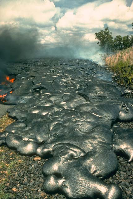 Toes of a pahoehoe flow advance across a road in Kalapana on the east rift zone of Kilauea Volcano, Hawaii. Pahoehoe is a Hawaiian term for basaltic lava that has a smooth, hummocky, or ropy surface. A pahoehoe flow typically advances as a series of small lobes and toes that continually break out from a cooled crust. The surface texture of pahoehoe flows varies widely, displaying all kinds of bizarre shapes often referred to as lava sculpture. Pahoehoe flows are much thinner than a'a flows, sometimes being only 30-50 centimeters (12 -20 inches) thick. |