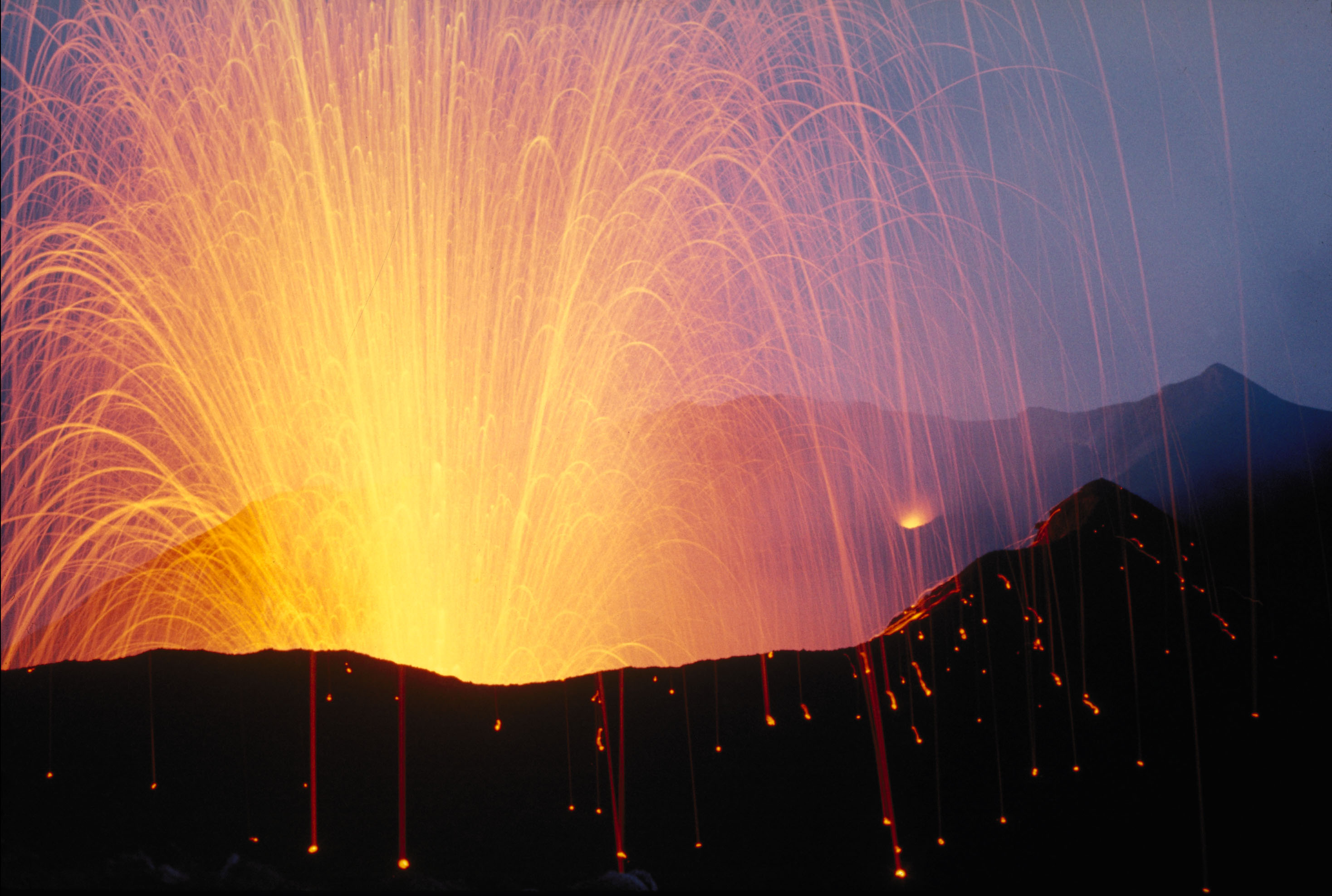 This image is a close view of Stromboli Volcano erupting incandescent molten lava framgents. Strombolian eruptions are characterized by the intermittent explosion or fountaining of basaltic lava from a single vent or crater. Each episode is caused by the release of volcanic gases, and they typically occur every few minutes or so, sometimes rhythmically and sometimes irregularly. The lava fragments generally consist of partially molten volcanic bombs that become rounded as they fly through the air.