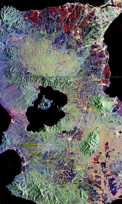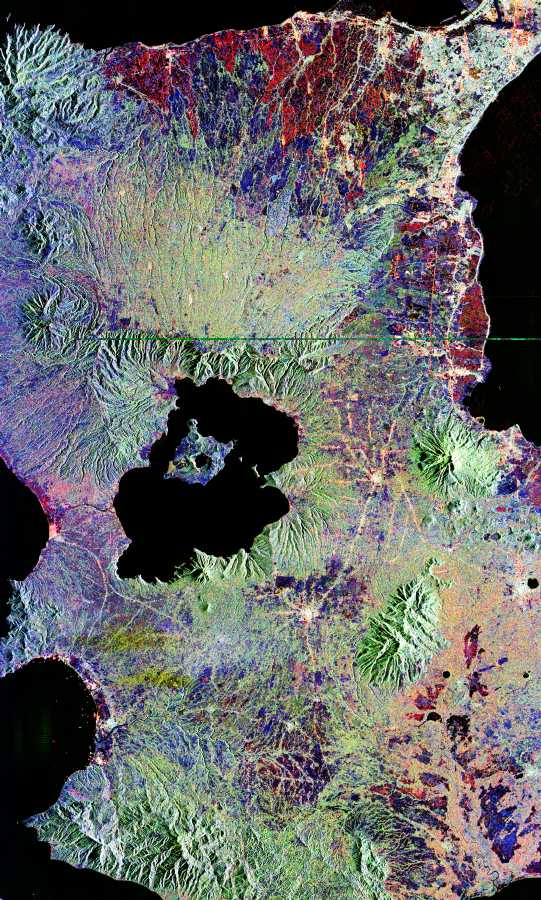 This is an image of Taal volcano, near Manila on the island of Luzon in the Philippines. The black area in the center is Taal Lake, which nearly fills the 30-kilometer-diameter (18- mile) caldera. The caldera rim consists of deeply eroded hills and cliffs. The large island in Taal Lake, which itself contains a crater lake, is known as Volcano Island. The bright yellow patch on the southwest side of the island marks the site of an explosion crater that formed during a deadly eruption of Taal in 1965. The image was acquired by the Spaceborne Imaging Radar-C/X-band Synthetic Aperture Radar (SIR-C/X-SAR) aboard the space shuttle Endeavour on its 78th orbit on October 5, 1994. The image shows an area approximately 56 kilometers by 112 kilometers (34 miles by 68 miles) that is centered at 14.0 degrees north latitude and 121.0 degrees east longitude. North is toward the upper right of the image. The colors in this image were obtained using the following radar channels: red represents the L- band (horizontally transmitted and received); green represents the L-band (horizontally transmitted and vertically received); blue represents the C-band (horizontally transmitted and vertically received). Since 1572, Taal has erupted at least 34 times. Since early 1991, the volcano has been restless, with swarms of earthquakes, new steaming areas, ground fracturing, and increases in water temperature of the lake. Volcanologists and other local authorities are carefully monitoring Taal to understand if the current activity may foretell an eruption. Taal is one of 15 "Decade Volcanoes" that have been identified by the volcanology community as presenting large potential hazards to population centers. The bright area in the upper right of the image is the densely populated city of Manila, only 50 kilometers (30 miles) north of the central crater. Spaceborne Imaging Radar-C/X-band Synthetic Aperture Radar (SIR-C/X-SAR) is part of NASA's Mission to Planet Earth. The radars illuminate Earth with microwaves, allowing detailed observations at any time, regardless of weather or sunlight conditions. SIR-C/X-SAR uses three microwave wavelengths: L-band (24 cm), C-band (6 cm) and X-band (3 cm). The multi- frequency data will be used by the international scientific community to better understand the global environment and how it is changing. The SIR-C/X-SAR data, complemented by aircraft and ground studies, will give scientists clearer insights into those environmental changes which are caused by nature and those changes which are induced by human activity. SIR-C was developed by NASA's Jet Propulsion Laboratory. X-SAR was developed by the Dornier and Alenia Spazio companies for the German space agency, Deutsche Agentur fuer Raumfahrtangelegenheiten (DARA), and the Italian space agency, Agenzia Spaziale Italiana (ASI), with the Deutsche Forschungsanstalt fuer Luft und Raumfahrt e.v.(DLR), the major partner in science, operations and data processing of X-SAR. This image is in the public domain and is copyright free. |