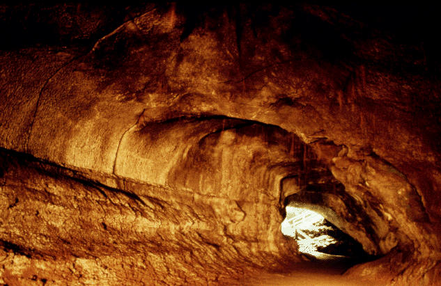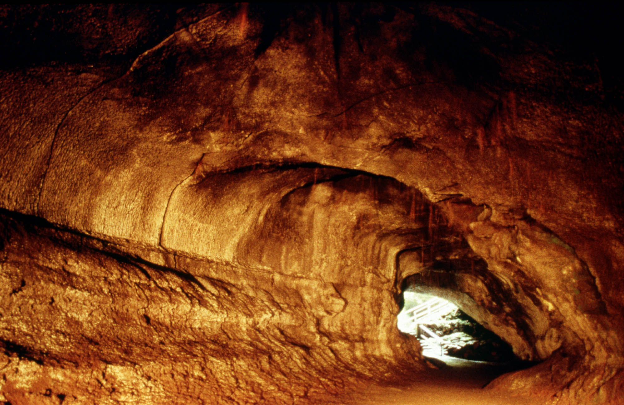 In Hawaii, many lava flows form tubes that may extend for several kilometers. This is an efficient way for the lava to travel comparatively large distances without significant cooling. Thurston Lava Tube, located close to the summit of Kilauea Caldera, is a fine example of this type of landform. Here the tube is approximately 3 meters (10 feet) in diameter. Note two lava benches on the wall on the left. |