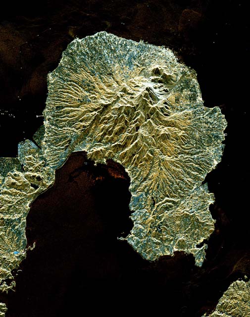 This is a space radar image of the area around the Unzen volcano, on the west coast of Kyushu Island in southwestern Japan. Unzen, which appears in this image as a large triangular peak with a white flank near the center of the peninsula, has been continuously active since a series of powerful eruptions began in 1991. The image was acquired by the Spaceborne Imaging Radar-C/X-band Synthetic Aperture Radar (SIR-C/X-SAR) aboard the space shuttle Endeavour on its 93rd orbit on April 15, 1994. The image shows an area 41.5 kilometers by 32.8 kilometers (25.7 miles by 20.3 miles) that is centered at 32.75 degrees north latitude and 130.15 degrees east longitude. North is toward the upper left of the image. The radar illumination is from the top of the image. The colors in this image were obtained using the following radar channels: red represents the L-band (vertically transmitted and received); green represents the average of L-band and C-band (vertically transmitted and received); blue represents the C-band (vertically transmitted and received). Unzen is one of 15 "Decade" volcanoes identified by the scientific community as posing significant potential threats to large local populations. The city of Shimabara sits along the coast at the foot of Unzen on its east and northeast sides. At the summit of Unzen a dome of thick lava has been growing continuously since 1991. Collapses of the sides of this dome have generated deadly avalanches of hot gas and rock known as pyroclastic flows. Volcanologists can use radar image data to monitor the growth of lava domes, to better understand and predict potentially hazardous collapses. Spaceborne Imaging Radar-C and X-band Synthetic Aperture Radar (SIR-C/X-SAR) is part of NASA's Mission to Planet Earth. The radars illuminate Earth with microwaves, allowing detailed observations at any time, regardless of weather or sunlight conditions. SIR-C/X-SAR uses three microwave wavelengths: L-band (24 cm), C-band (6 cm) and X-band (3 cm). The multi-frequency data will be used by the international scientific community to better understand the global environment and how it is changing. The SIR-C/X-SAR data, complemented by aircraft and ground studies, will give scientists clearer insights into those environmental changes which are caused by nature and those changes which are induced by human activity. SIR-C was developed by NASA's Jet Propulsion Laboratory. X-SAR was developed by the Dornier and Alenia Spazio companies for the German space agency, Deutsche Agentur fuer Raumfahrtangelegenheiten (DARA), and the Italian space agency, Agenzia Spaziale Italiana (ASI), with the Deutsche Forschungsanstalt fuer Luft und Raumfahrt e.V.(DLR), the major partner in science, operations and data processing of X-SAR. This image is in the public domain and is copyright free. |