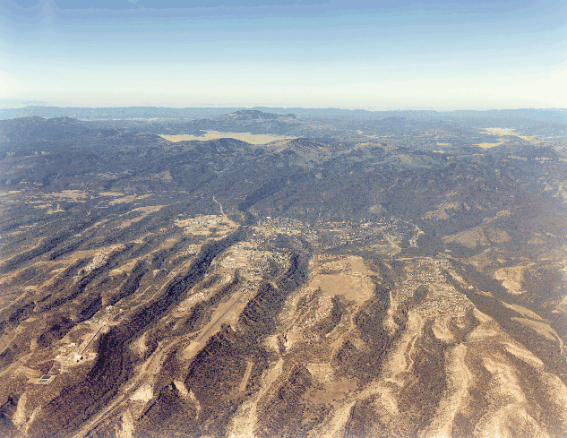 This view is looking west across the dissected Bandelier Tuff of the Pajarito Plateau. The view looks across the lava domes and composite cones of the pre-2-million-year Jemez volcanic field (middle) into the Valles caldera. The grassy area, located at the center top, is the southeast quarter of the caldera. Los Alamos, New Mexico is in the foreground. |