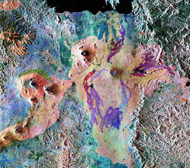 This is a false-color composite of Central Africa, showing the Virunga volcano chain along the borders of Rwanda, Zaire and Uganda. This area is home to the endangered mountain gorillas. The image was acquired on October 3, 1994, on orbit 58 of the space shuttle Endeavour by the Spaceborne Imaging Radar-C/X-band Synthetic Aperture Radar (SIR-C/X- SAR). In this image red is the L-band (horizontally transmitted, vertically received) polarization; green is the C-band (horizontally transmitted and received) polarization; and blue is the C-band (horizontally transmitted and received) polarization. The area is centered at about 2.4 degrees south latitude and 30.8 degrees east longitude. The image covers an area 56 kilometers by 70 kilometers (35 miles by 43 miles). The dark area at the top of the image is Lake Kivu, which forms the border between Zaire (to the right) and Rwanda (to the left). In the center of the image is the steep cone of Nyiragongo volcano, rising 3,465 meters (11,369 feet) high, with its central crater now occupied by a lava lake. To the left are three volcanoes, Mount Karisimbi, rising 4,500 meters (14,800 feet) high; Mount Sabinyo, rising 3,600 meters (12,000 feet) high; and Mount Muhavura, rising 4,100 meters (13,500 feet) high. To their right is Nyamuragira volcano, which is 3,053 meters (10,017 feet) tall, with radiating lava flows dating from the 1950s to the late 1980s. These active volcanoes constitute a hazard to the towns of Goma, Zaire and the nearby Rwandan refugee camps, located on the shore of Lake Kivu at the top left. This radar image highlights subtle differences in the vegetation of the region. The green patch to the center left of the image in the foothills of Karisimbi is a bamboo forest where the mountain gorillas live. The vegetation types in this area are an important factor in the habitat of mountain gorillas. Researchers at Rutgers University in New Jersey and the Dian Fossey Gorilla Fund in London will use this data to produce vegetation maps of the area to aid in their studies of the last 650 mountain gorillas in the world. The faint lines above the bamboo forest are the result of agricultural terracing by the people who live in the region. Spaceborne Imaging Radar-C and X-Synthetic Aperture Radar (SIR-C/X-SAR) is part of NASA's Mission to Planet Earth. The radars illuminate Earth with microwaves, allowing detailed observations at any time, regardless of weather or sunlight conditions. SIR-C/X-SAR uses three microwave wavelengths: L-band (24 cm), C-band (6 cm) and X-band (3 cm). The multi- frequency data will be used by the international scientific community to better understand the global environment and how it is changing. The SIR-C/X-SAR data, complemented by aircraft and ground studies, will give scientists clearer insights into those environmental changes which are caused by nature and those changes which are induced by human activity. SIR-C was developed by NASA's Jet Propulsion Laboratory. X-SAR was developed by the Dornier and Alenia Spazio companies for the German space agency, Deutsche Agentur fuer Raumfahrtangelegenheiten (DARA), and the Italian space agency,Agenzia Spaziale Italiana (ASI), with the Deutsche Forschungsanstalt fuer Luft und Raumfahrt e.V. (DLR), the major partner in science, operations and data processing of X-SAR. This image is in the public domain and is copyright free. |
