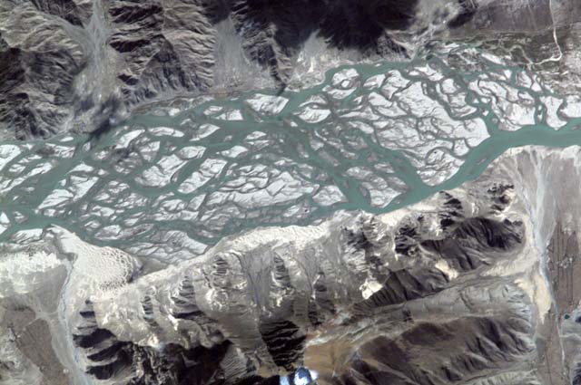 This view of Tibet’s Brahmaputra River was taken on Oct. 13, 2000, by the Expedition 3 crew. This Asian river carves a narrow west-east valley between the Tibetan Plateau to the north and the Himalaya Mountains to the south, as it rushes eastward for more than 1,500 km in southwestern China. This area pictured is a 15-km stretch south of the ancient Tibetan capital of Lhasa where the river flow becomes intricately braided as it works and reworks its way through extensive deposits of erosional material. |