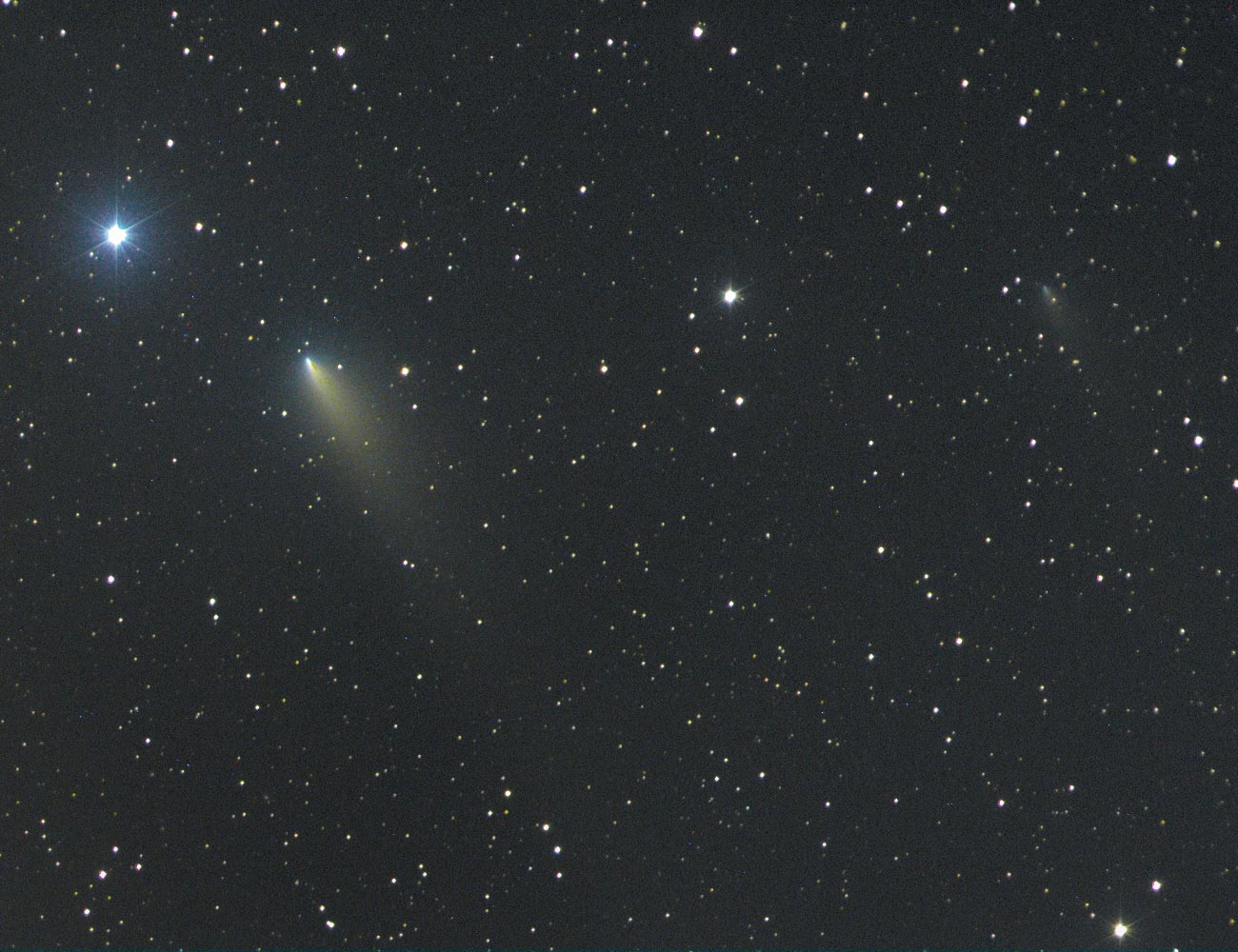 Ground-based color composite image of Comet 73P/Schwassmann-Wachmann 3 fragments B and G on April 21, 2006 made with a 8" f/1.5 Schmidt Camera. |