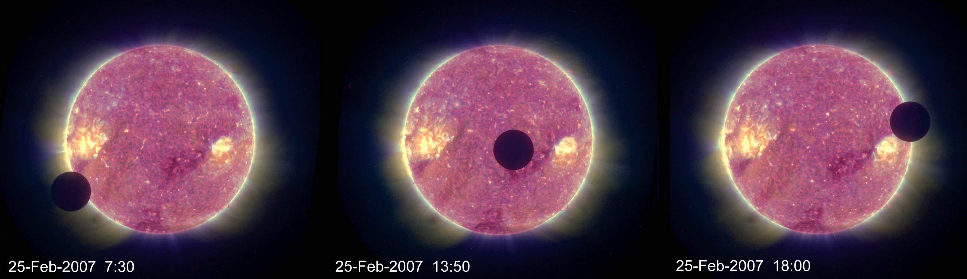 This shows 3 frames from the Feb. 25, 2007 movie of the transit of the Moon across the face of the Sun. This sight was visible only from the STEREO-B spacecraft in its orbit about the sun, trailing behind the Earth. NASA's STEREO mission consists of two spacecraft launched in October, 2006 to study solar storms. The transit started at 1:56 am EST and continued for 12 hours until 1:57 pm EST. STEREO-B is currently about 1 million miles from the Earth, 4.4 times farther away from the Moon than we are on Earth. As the result, the Moon appeared 4.4 times smaller than what we are used to. This is still, however, much larger than, say, the planet Venus appeared when it transited the Sun as seen from Earth in 2004. This alignment of STEREO-B and the Moon is not just due to luck. It was arranged with a small tweak to STEREO-B's orbit last December. The transit is quite useful to STEREO scientists for measuring the focus and the amount of scattered light in the STEREO imagers and for determining the pointing of the STEREO coronagraphs. The Sun as it appears in these the images and each frame of the movie is a composite of nearly simultaneous images in four different wavelengths of extreme ultraviolet light that were separated into color channels and then recombined with some level of transparency for each. |