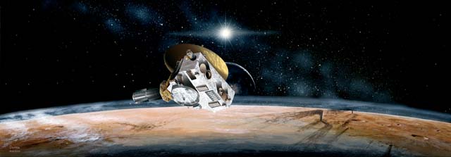 Artist's concept of the New Horizons spacecraft during its planned encounter with Pluto and its moon, Charon. The craft's miniature cameras, radio science experiment, ultraviolet and infrared spectrometers and space plasma experiments would characterize the global geology and geomorphology of Pluto and Charon, map their surface compositions and temperatures, and examine Pluto's atmosphere in detail. The spacecraft's most prominent design feature is a nearly 7-foot (2.1-meter) dish antenna, through which it would communicate with Earth from as far as 4.7 billion miles (7.5 billion kilometers) away. |