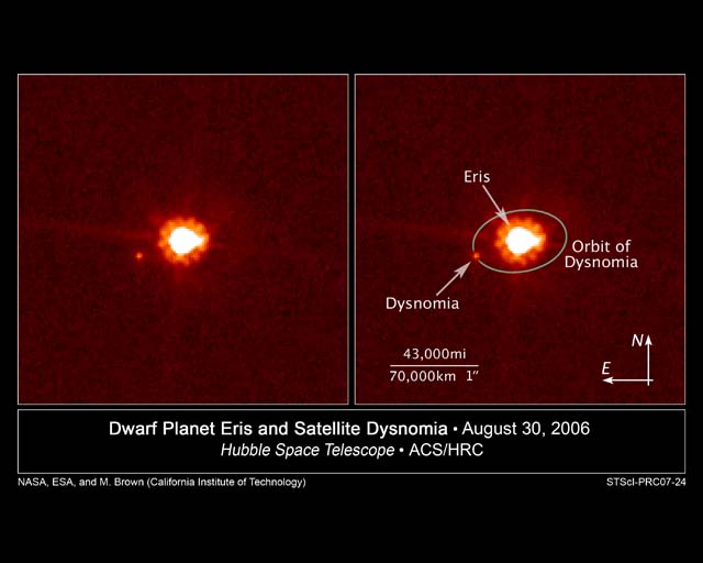 [Left] - This is an image of the dwarf planet Eris (center) and its satellite Dysnomia (at 9 o'clock position) taken with NASA's Hubble Space Telescope on Aug. 30, 2006. Hubble observations were obtained on Dec. 3, 2005 and Aug. 30, 2006 using the Advanced Camera for Surveys. The Hubble images were combined with images from the Keck telescopes taken on Aug. 20, 21, 30, and 31 to measure the satellite's orbit and calculate a mass for Eris, which is the largest dwarf planet in the solar system. [Right] - Labeled version of the above mentioned image of dwarf planet Eris and its satellite Dysnomia taken with NASA's Hubble Space Telescope on Aug. 30, 2006. Dysnomia's projected orbit around Eris is superimposed on the image. Credit: NASA, ESA, and M. Brown (California Institute of Technology) |