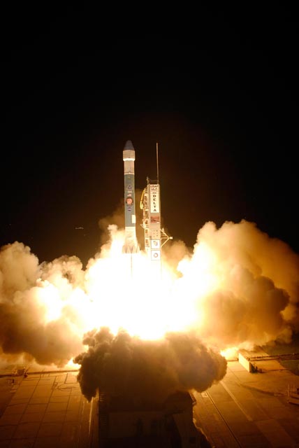 KENNEDY SPACE CENTER, FLA. - NASA's Phoenix Mars lander illuminates Launch Pad 17A as it lifts off aboard a Delta II 7925 rocket at 5:26 a.m. EDT from Cape Canaveral Air Force Station. Phoenix will land in icy soils near the north polar, permanent ice cap of Mars and explore the history of the water in these soils and any associated rocks, while monitoring polar climate. Landing on Mars is planned in May 2008 on arctic ground where a mission currently in orbit, Mars Odyssey, has detected high concentrations of ice just beneath the top layer of soil. Photo credit: NASA/Tony Gray and Robert Murray |