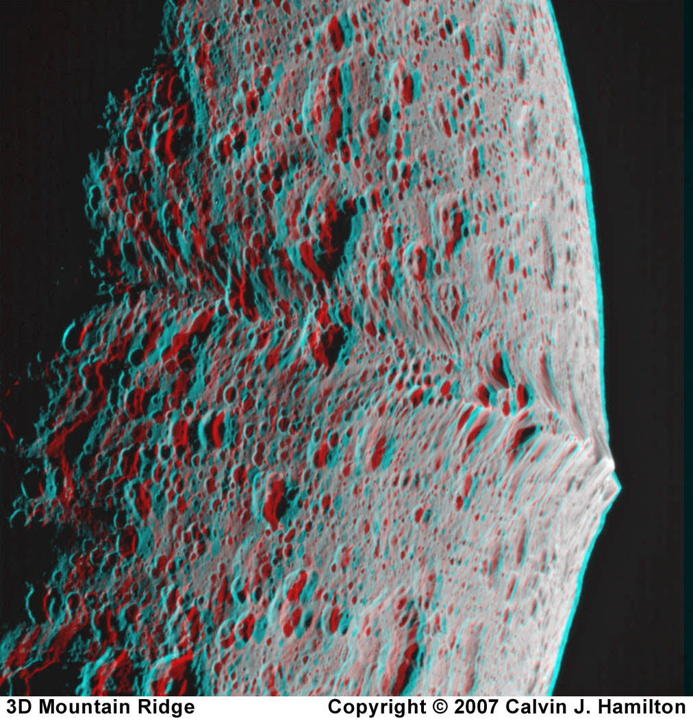This shows a 3D view of a ridge on Iapetus. The image was taken on September 10, 2007, with the Cassini spacecraft wide-angle camera at a distance of approximately 5,620 kilometers from Iapetus. |