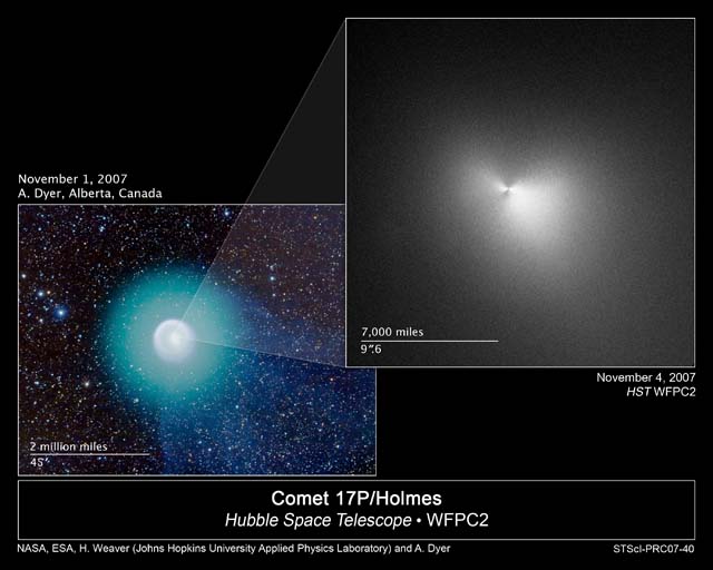 NASA's Hubble Space Telescope has probed the bright core of Comet 17P/Holmes, which, to the delight of sky watchers, mysteriously brightened by nearly a millionfold in a 24-hour period beginning Oct. 23, 2007. Astronomers used Hubble's powerful resolution to study Comet Holmes' core for clues about how the comet brightened. The orbiting observatory's Wide Field Planetary Camera 2 (WFPC2) monitored the comet for several days, snapping images on Oct. 29, Oct. 31, and Nov. 4. Hubble's crisp "eye" can see objects as small as 33 miles (54 kilometers) across, providing the sharpest most detailed view yet of the source of the spectacular brightening. The Hubble image at right, taken Nov. 4, shows the heart of the comet. The central portion of the image has been specially processed to highlight variations in the dust distribution near the nucleus. About twice as much dust along lies along the east-west direction (the horizontal direction) as along the north-south direction (the vertical direction), giving the comet a "bow tie" appearance. The composite color image at left, taken Nov. 1 by an amateur astronomer, shows the complex structure of the entire coma, consisting of concentric shells of dust and a faint tail emanating from the comet's right side. The nucleus-the small solid body that is the ultimate source of all the comet's activity-is still swaddled in bright dust, even 12 days after the spectacular outburst. "Most of what Hubble sees is sunlight scattered from microscopic particles," explained Hal Weaver of The Johns Hopkins University Applied Physics Laboratory in Laurel, Md., who led the Hubble investigation. "But we may finally be starting to detect the emergence of the nucleus itself in this final Hubble image." Hubble first observed Comet 17P/Holmes on June 15, 1999, when there was virtually no dusty shroud around the nucleus. From that observation, astronomers deduced that the nucleus had a diameter of approximately 2.1 miles (3.4 kilometers), about the length of New York City's Central Park. Astronomers hope to use the new Hubble images to determine the size of the comet's nucleus to see how much of it was blasted away during the outburst. Hubble's two earlier snapshots of Comet Holmes also showed some interesting features. On Oct. 29, the telescope spied three "spurs" of dust emanating from the nucleus, while the Hubble images taken on Oct. 31 revealed an outburst of dust just west of the nucleus. The Hubble images, however, do not show any large fragments near the nucleus of Comet Holmes, unlike the case of Comet 73P/Schwassmann-Wachmann 3 (SW3). In the spring of 2006 Hubble observations revealed a multitude of "mini-comets" ejected by SW3 after the comet increased dramatically in brightness. Ground-based images of Comet Holmes show a large, spherically symmetrical cloud of dust that is offset from the nucleus, suggesting that a large fragment did break off and subsequently disintegrated into tiny dust particles after moving away from the main nucleus. Unfortunately, the huge amount of dust near the comet's nucleus and the comet's relatively large distance from Earth (149 million miles, or 1.6 astronomical units, for Holmes versus 9 million, or 0.1 astronomical unit for SW3), make detecting fragments near Holmes nearly impossible right now, unless the fragments are nearly as large as the nucleus itself. The Hubble Comet Holmes observing team comprises H. Weaver and C. Lisse (The Johns Hopkins University Applied Physics Laboratory); P. Lamy (Laboratoire d'Astrophysique de Marseille, France); I. Toth (Konkoly Observatory, Hungary); M. Mutchler (Space Telescope Science Institute); W. Reach (California Institute of Technology); and J. Vaubaillon (California Institute of Technology). |