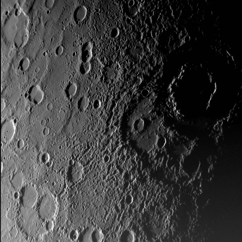 As MESSENGER approached Mercury on January 14, 2008, the spacecraft's Narrow-Angle Camera on the Mercury Dual Imaging System (MDIS) instrument captured this view of the planet's rugged, cratered landscape illuminated obliquely by the Sun. The large, shadow-filled, double ringed crater to the upper right was glimpsed by Mariner 10 more than three decades ago and named Vivaldi, after the Italian composer. Its outer ring has a diameter of about 200 kilometers (about 125 miles). MESSENGER's modern camera has revealed detail that was not well seen by Mariner 10, including the broad ancient depression overlapped by the lower-left part of the Vivaldi crater. The MESSENGER science team is in the process of evaluating later images snapped from even closer range showing features on the side of Mercury never seen by Mariner 10. It is already clear that MESSENGER's superior camera will tell us much that could not be resolved even on the side of Mercury viewed by Mariner's vidicon camera in the mid-1970s. This MESSENGER image was taken from a distance of about18,000 kilometers (11,000 miles), about 56 minutes before the spacecraft's closest encounter with Mercury. It shows a region roughly 500 kilometers (300 miles) across, and craters as small as 1 kilometer (0.6 mile) can be seen in this image. Credit: NASA/Johns Hopkins University Applied Physics Laboratory/Carnegie Institution of Washington |
